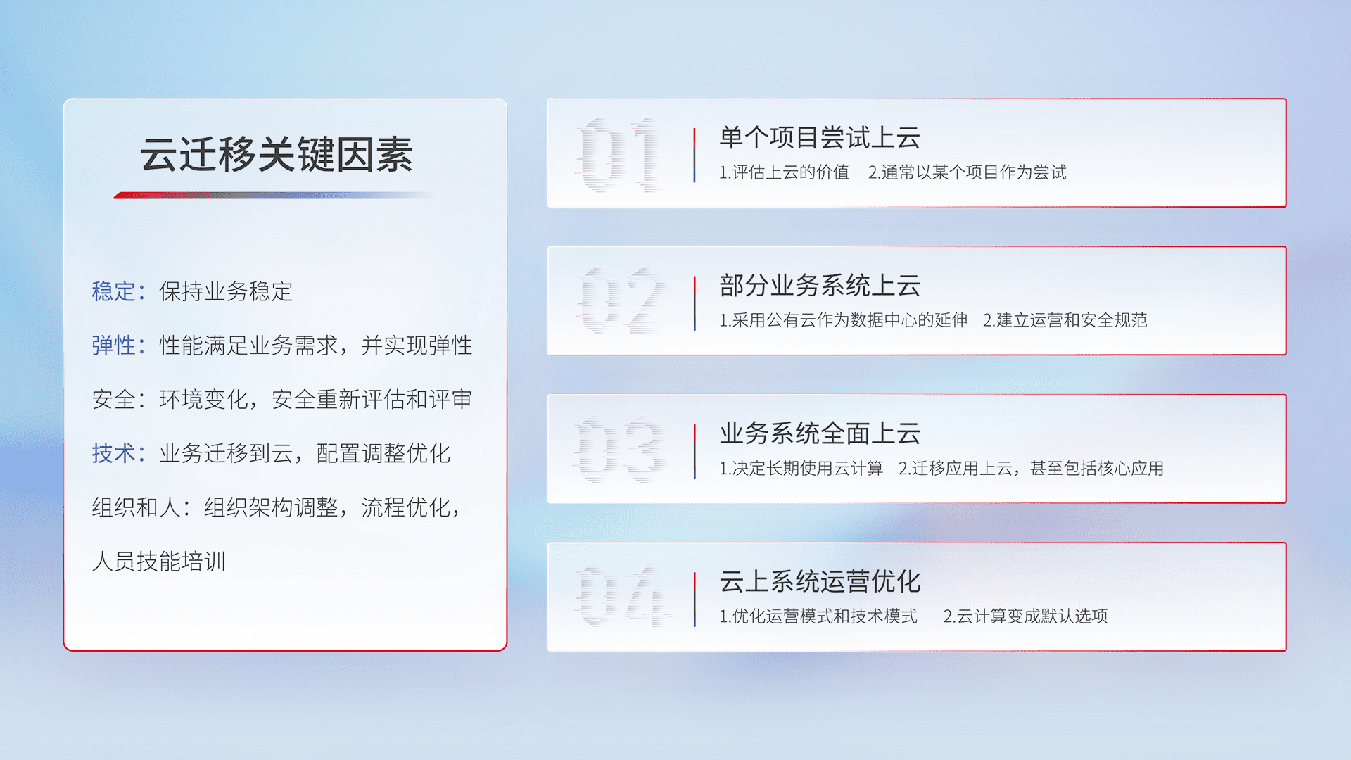 结合实际业务,,从规划设计、、、、云平台选型、、、云原生改造、、、数据迁移、、、集成交付,,,,迁移全过程为客户识别最佳上云路径,,做好风险识别管理,,设计网络架构、、、身份权限、、、安全审计合规、、操作审计、、、、日志审计、、、监控告警策略、、、多站点容灾设计等,,,,对云上基础设施进行整体规划,,,提升IT治理水平,,,以满足弹性、、、高可用、、、、高性能的需求。。