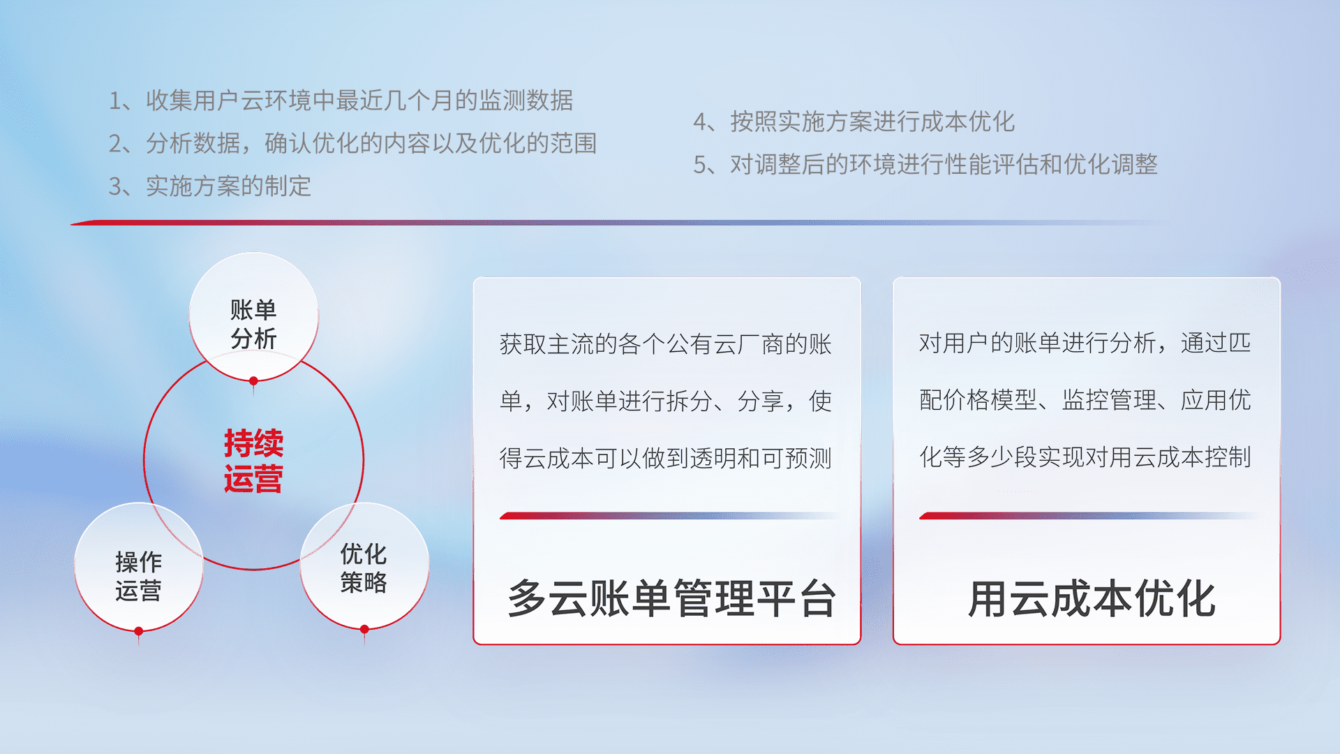 通过多云纳管,,,以统一的资源数据模型把客户的云资源进行抽象和封装,,进而实现对多云资源的统一操作,,,,保障云资源管理的可靠性、、、、稳定性与可用性。。。。量身定制化运维内容,,,,配置、、、、开发运维、、、、补丁管理、、备份、、监控、、认证和访问管理、、、、审计和日常巡检等,,保障在用云过程中的可靠度,,,稳定度以及高可用率。。。。