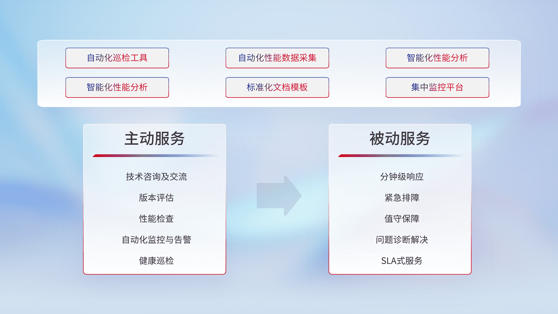 智能化工具和标准化文档,,,,保障服务质量,,,,提供主动服务(包含技术咨询、、、、版本评估、、、性能检查、、、自动化监控与告警、、、健康巡检)和被动服务包含(分钟级响应、、紧急排障、、值守保障、、、问题诊断解决、、、SLA服务)。。。。