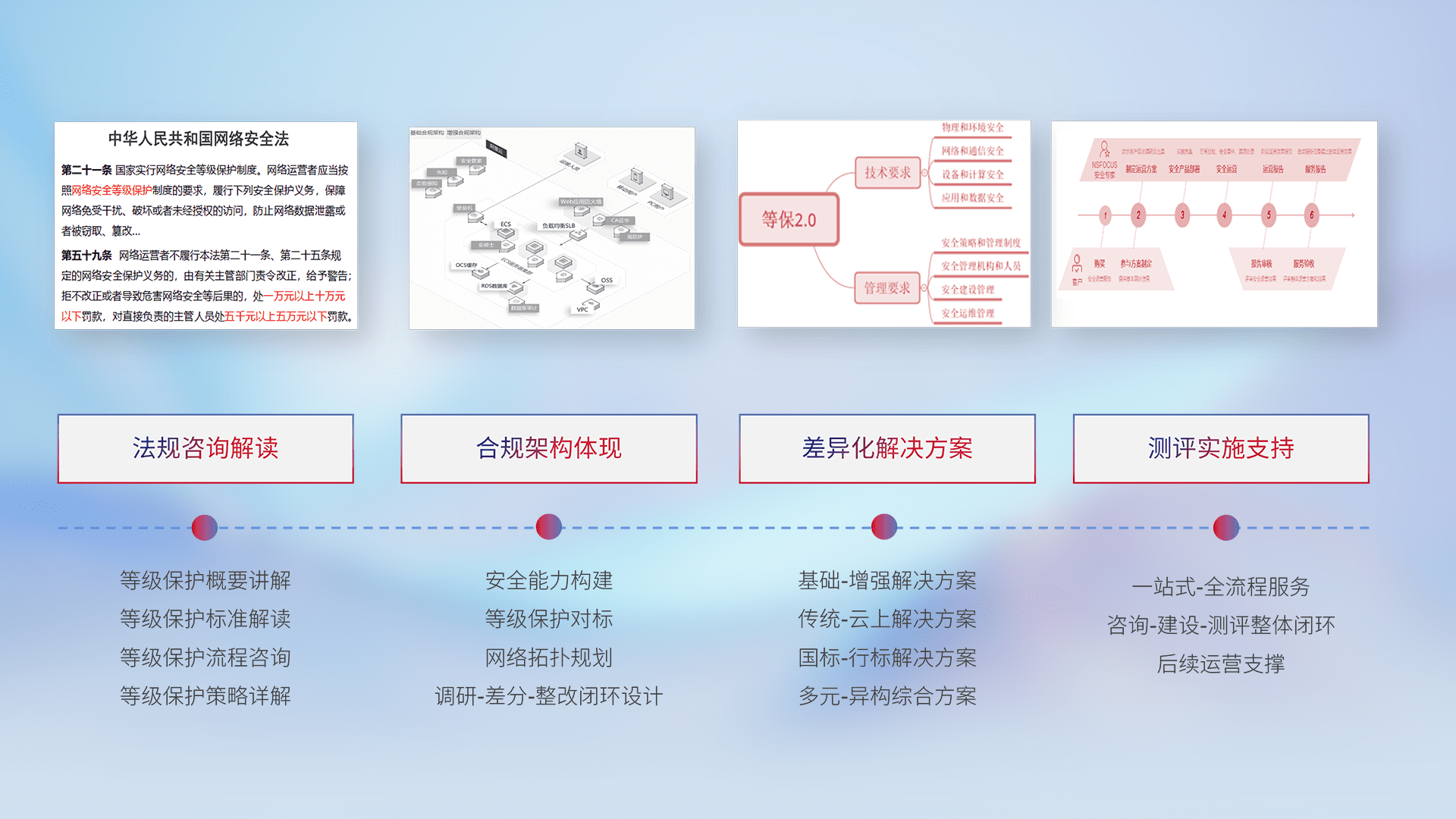 通过专业的法律咨询解读、、、、合规架构体现、、差异化解决方案、、、测试实施支持等服务,,,,为客户量身打造等保合规体系。。
